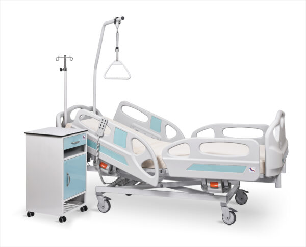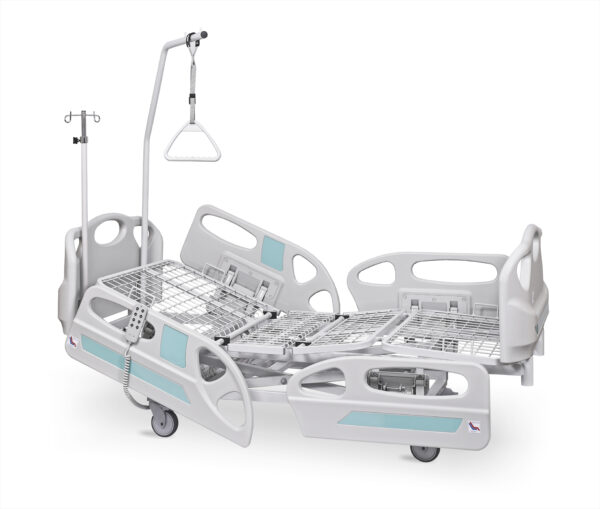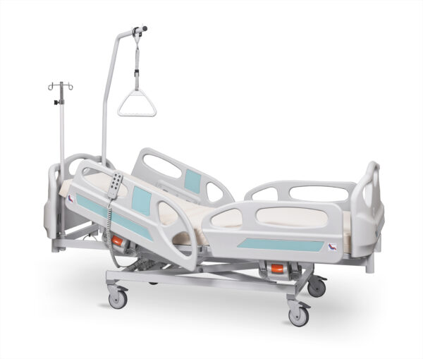 Funkcjonalne łóżko szpitalne z czterosegmentowym leżem, umożliwiające wygodną regulację pozycji pacjenta za pomocą siłowników elektrycznych sterowanych pilotem z funkcją blokady. Solidna stalowa konstrukcja pokryta farbą proszkową zapewnia odporność na środki chemiczne, uszkodzenia mechaniczne oraz promieniowanie UV. Łóżko wyposażone jest w elektryczną regulację wysokości, podwójne barierki boczne zabezpieczające pacjenta oraz cztery koła jezdne z indywidualną blokadą.